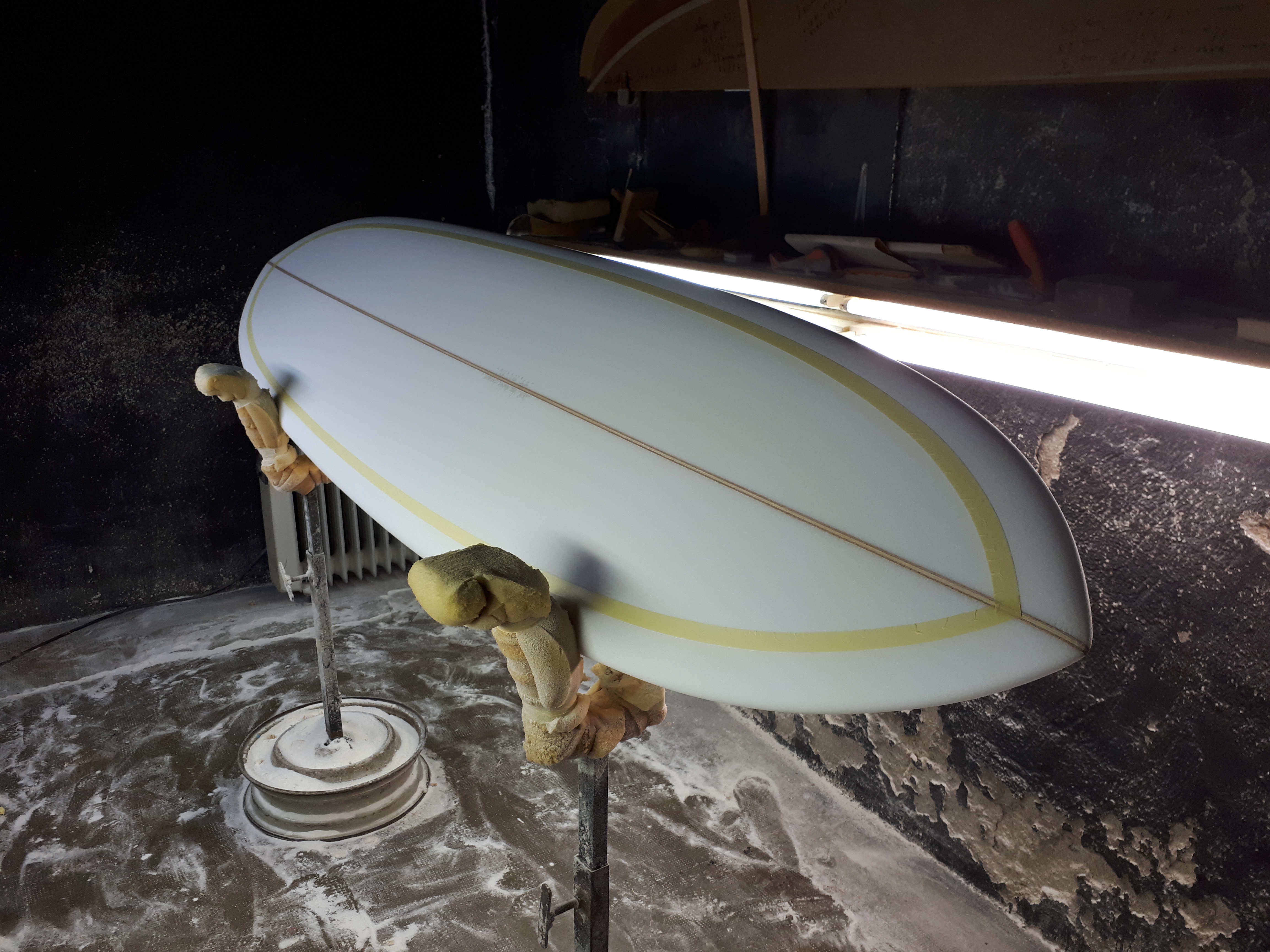 Surf très agréable à surfer. Très gros travail de handshape aux niveaux des rails afin de bien les tomber afin que cette planche très rapide puisse fendre l'eau sans que le rail fasse une face d'appui. Un bon quick arrière résorbé par un double vee concave. Vu la largeur du tail le vee s'imposait partant très doucement du maître bau et finissant à son maximum au niveau des dérives. Une magnifique création une fois de plus qui méritait bien un double cut lap avec une résine teintée et un polish miroir.